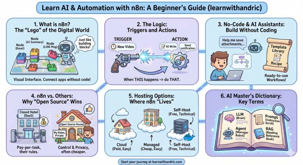 - Example: Imagine you have a box of Legos. One piece is “Read an Email,” another piece is “Summarize with AI,” and a third piece is “Send a LINE Message.” n8n is the platform where you snap these pieces together to build a functional machine.