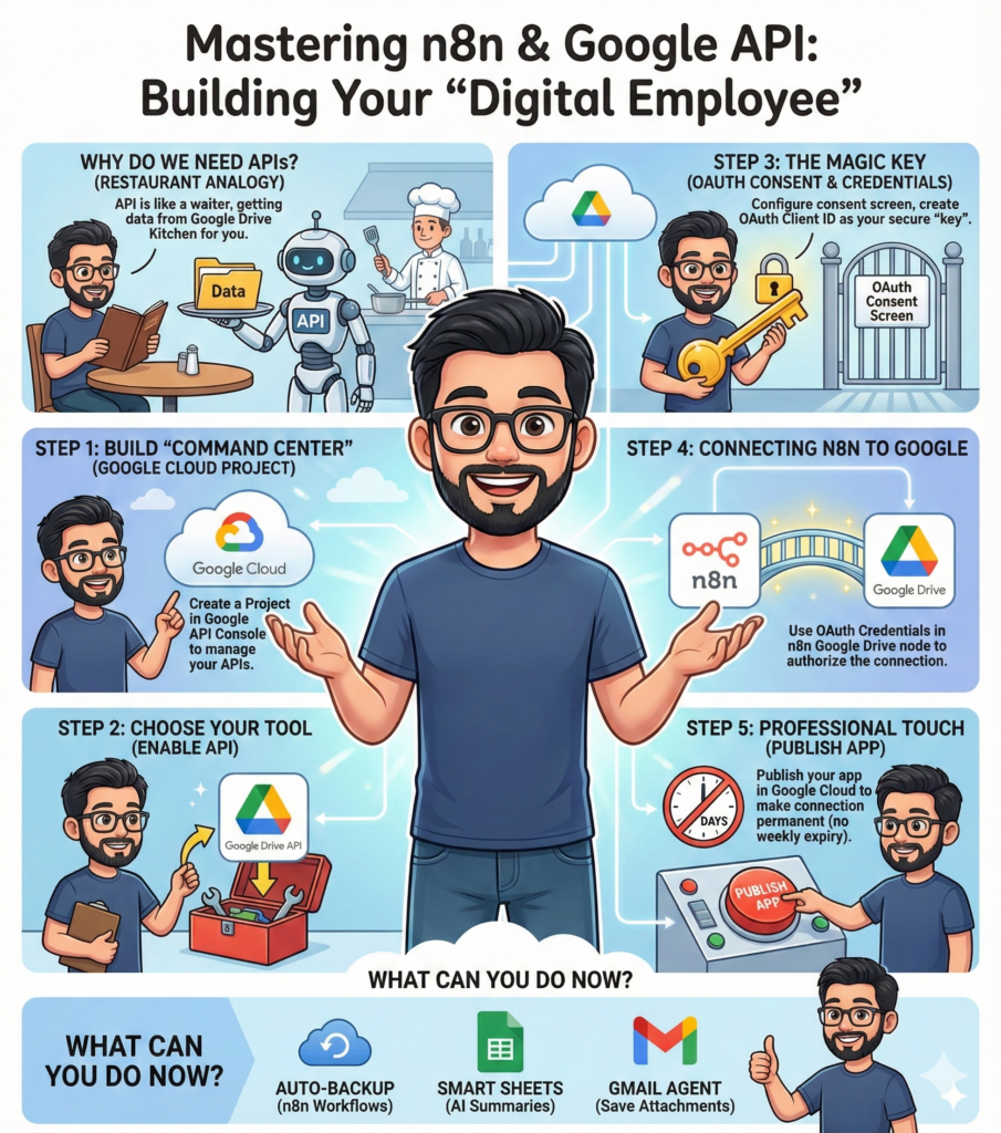 [IMAGE NEEDED: An illustration showing n8n as a person sitting at a table, a “Google Drive” kitchen in the background, and a friendly robot waiter labeled “API” carrying a data folder.]