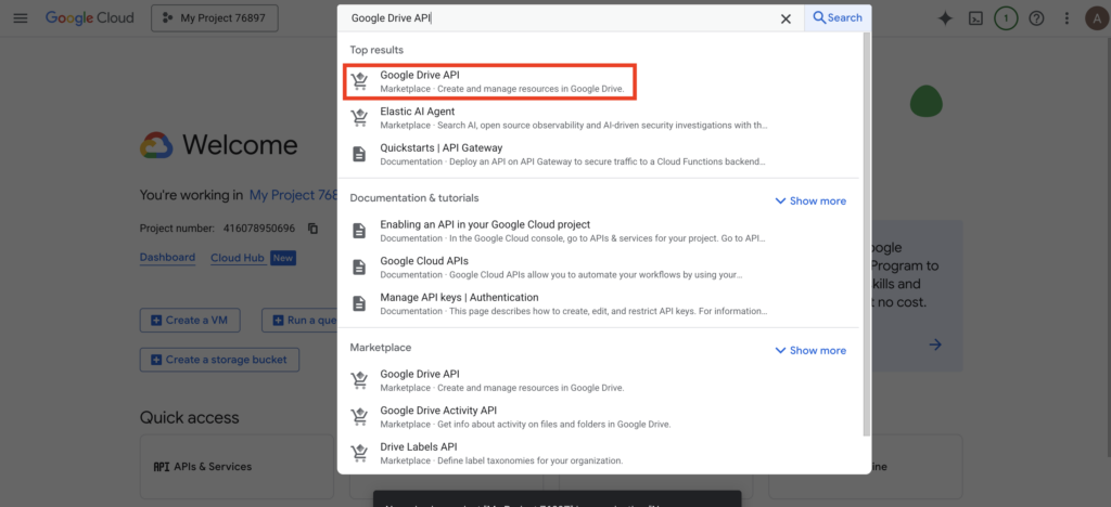 - In the search bar at the top, type “Google Drive API”.