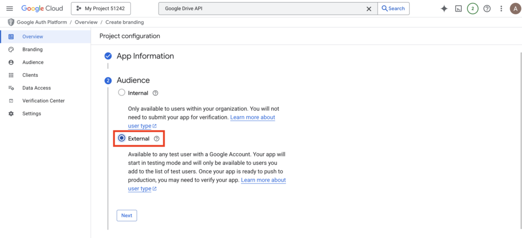 - Choose “External” for User Type and click Next.