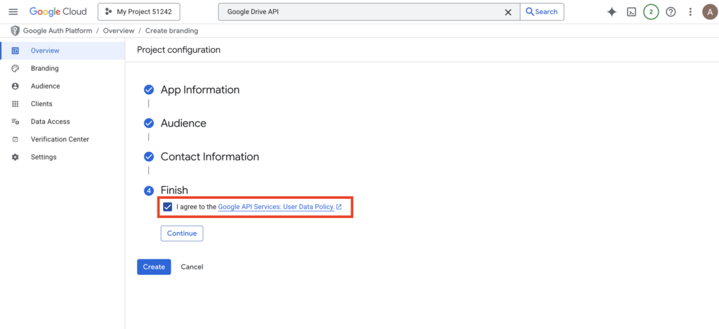 - Agree to the service terms and click “Continue”. Click “Create” to finalize the screen setup.