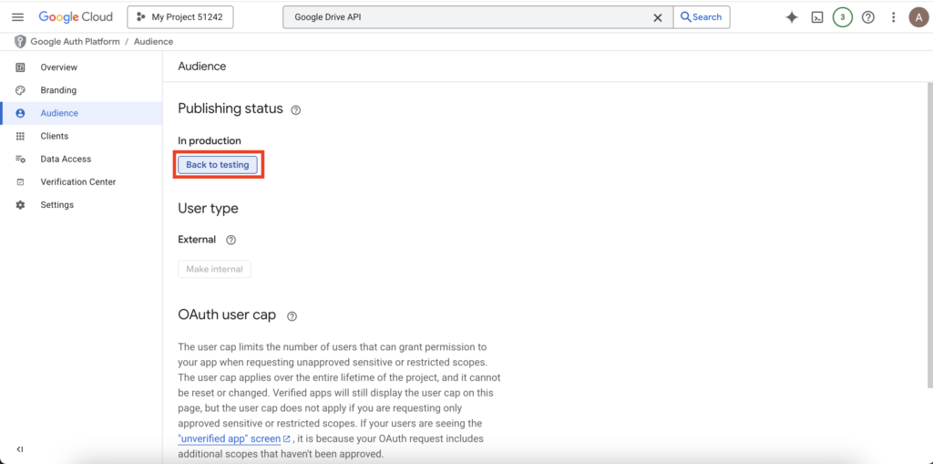1. Go back to the OAuth consent screen in Google Cloud. Under “Publishing status,” click “Publish App”.