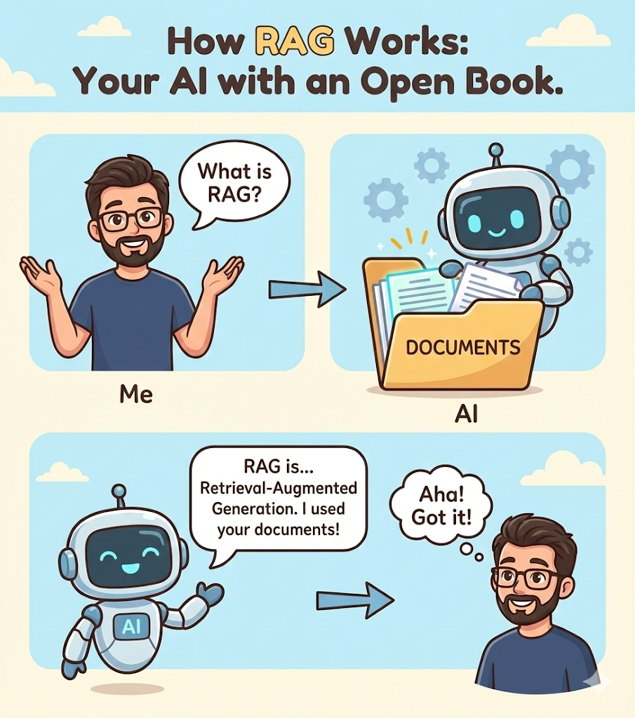 Think of a standard AI (like ChatGPT) as a very smart student taking an exam from memory. Sometimes, they might forget a detail or “hallucinate” (make up) an answer. RAG is like giving that student an “Open Book” exam. The AI first looks at your specific documents (The Book) and then answers the question based only on that information.