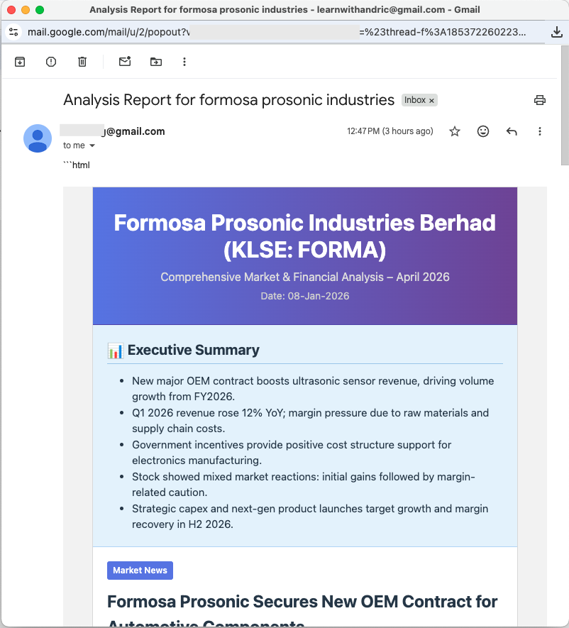 我将分享 KLSE AI Stock Analysis n8n 模板。只需将股票代码(如 MAYBANK 或 TENAGA)发给 Telegram 机器人,几秒钟内就能在手机和邮箱中收到一份专业机构级的分析报告。