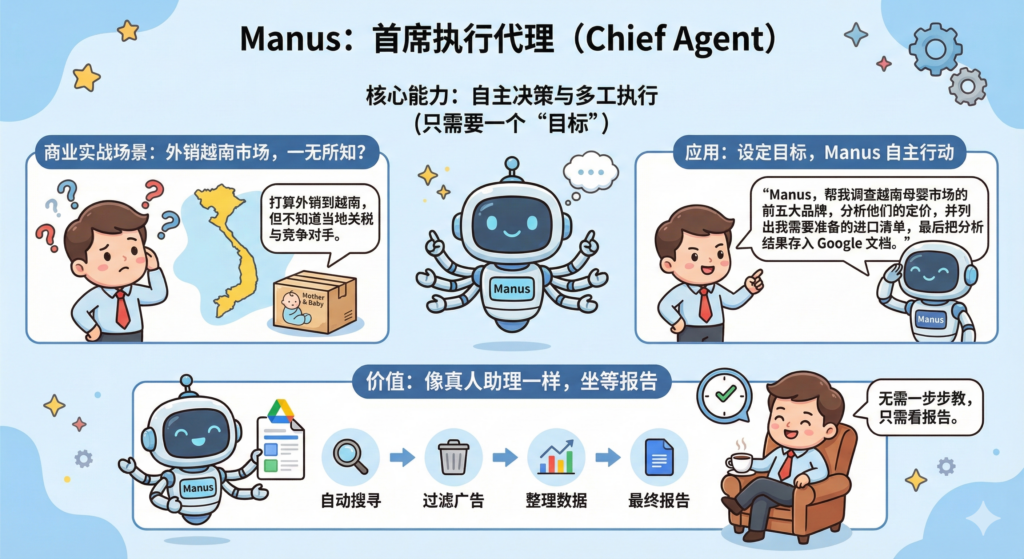 - 应用: 给 Manus 设定目标:“Manus,帮我调查越南母婴市场的前五大品牌,分析他们的定价,并列出我需要准备的进口清单,最后把分析结果存入 Google 文档。”