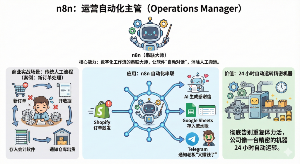 - 应用: 使用 n8n 串联:Shopify 订单触发 → AI 生成感谢信 → Google Sheets 存入流水账 → Telegram 通知老板“又赚钱了”。