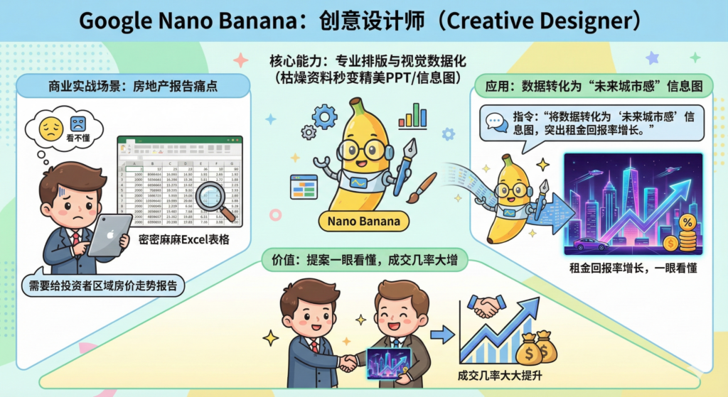 - 应用: 提供数据给 Nano Banana,指令:“将这些数据转化为一张‘未来城市感’的信息图,让投资者一眼就能看到租金回报率的增长。”