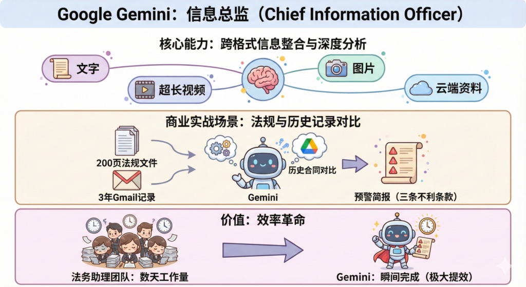- 应用: 直接询问 Gemini:“根据我 Drive 里的历史合同,对比这份最新的法规文件,找出对我们公司最不利的三个条款,并写一份预警简报。”